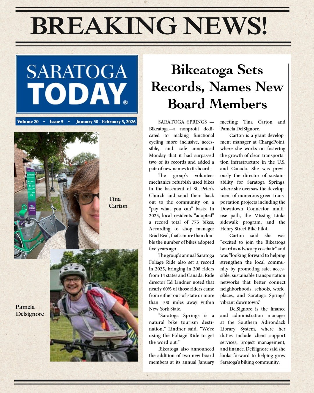 Bikeatoga is a non-profit organization located in the heart of Saratoga Springs, NY. We are dedicated to pedaling toward a brighter future for our town by making functional cycling more convenient, accessible, and safer for all the members of our community. Our amazing, fully volunteer, team are all passionate about spreading the environmental, economic, and health-related benefits of everyday cycling. Together, we believe that we can create a safer, healthier, more vibrant, and more sustainable community.