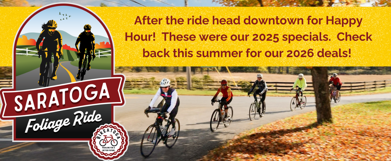 Offer good for riders wearing 2025 SFR wristbands. Red wristbands good for both days. Orange wristbands good for Saturday only. Yellow wristbands for Sunday. Home $7 craft beer drafts Saturday, Sunday from 4-6PMHenry Street Taproom, 86 Henry Street, Saratoga Springs $6 craft drafts, $6 wine by the glass, $9 cocktails, $10 pizza, $5 snacks!Saturday, Sunday from 4-6PMWhitman Brewing Company, 20 Lake Avenue, Saratoga Springs $10 select bubblesSaturday, Sunday from 4-6PMBocage Champagne Bar, 10 Phila Street, Saratoga Springs $5 draft brews only and 1/2 price cocktailsSaturday, Sunday from 4-6PMCooperstown Distillery, 453 Broadway, Saratoga Springs $5 craft drafts and house winesSaturday only from 4-6PMBibulous, 35 Henry Street, Saratoga Springs $7 wine by the glass on selected poursSaturday only from 4-6PMKindred, 84 Henry Street, Saratoga Springs